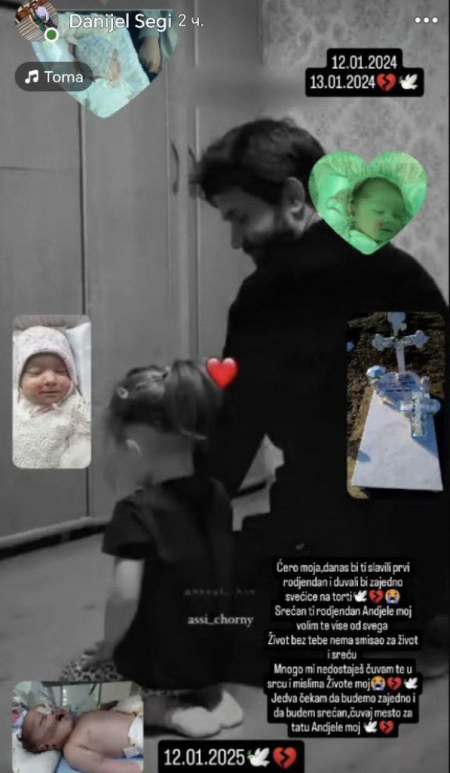 Ćero moja, danas bismo ti slavili prvi rođendan i duvali bismo zajedno svećice na torti. Srećan ti rođendan, anđele moj, volim te više od svega. Život bez tebe nema smisao za život i sreću. Mnogo mi nedostaješ. Čuvam te u srcu i mislima, živote moj. Jedva čekam da budemo zajedno i da budem srećan. Čuvaj mesto za tatu, anđele moj!