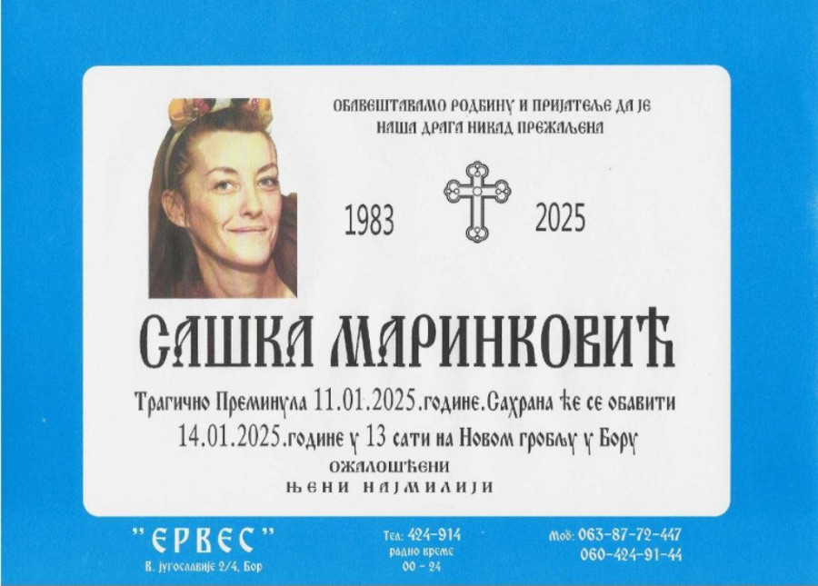 Saška Marinković (42) koja je nastradala u saobraćajnon ne, kako su za Republiku rekli u Boru, iz tri braka ima troje dece. Najstarija je ćerka od oko 20 godina, ima sina koji je šesti razred i malu ćerkicu.