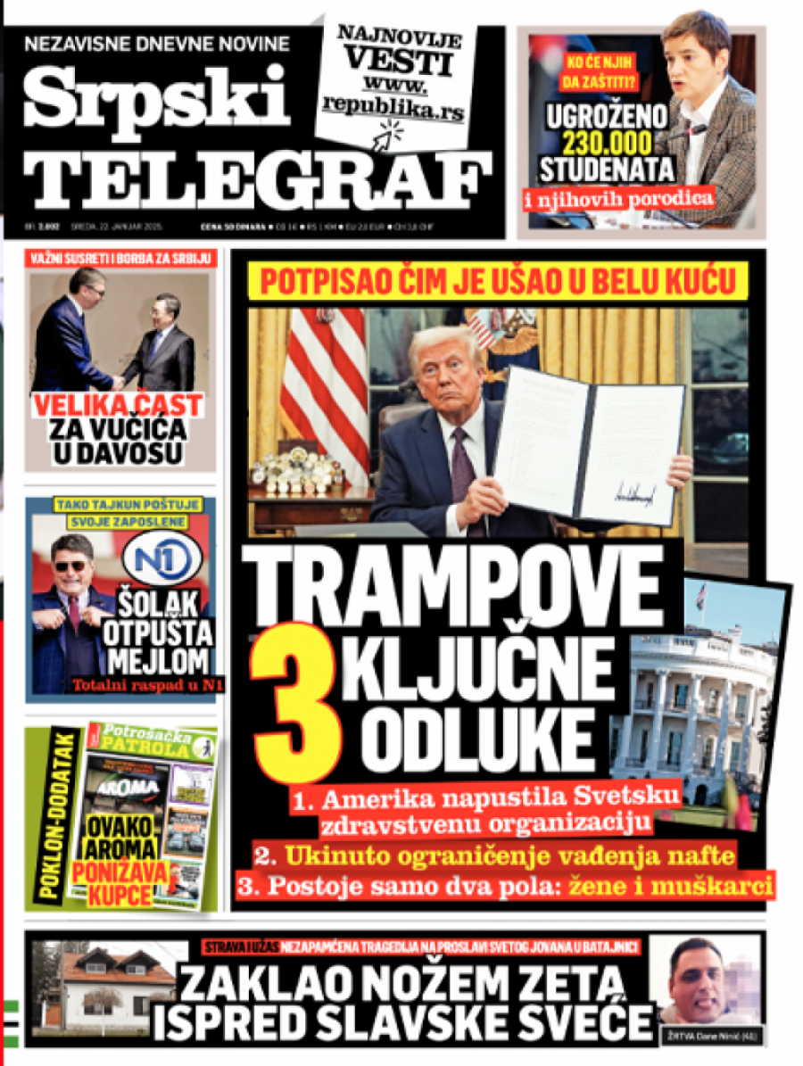 Srpski telegraf u izdanju za sredu 22. januar 2025. godine donosi pregršt novih i zanimljivih priča!