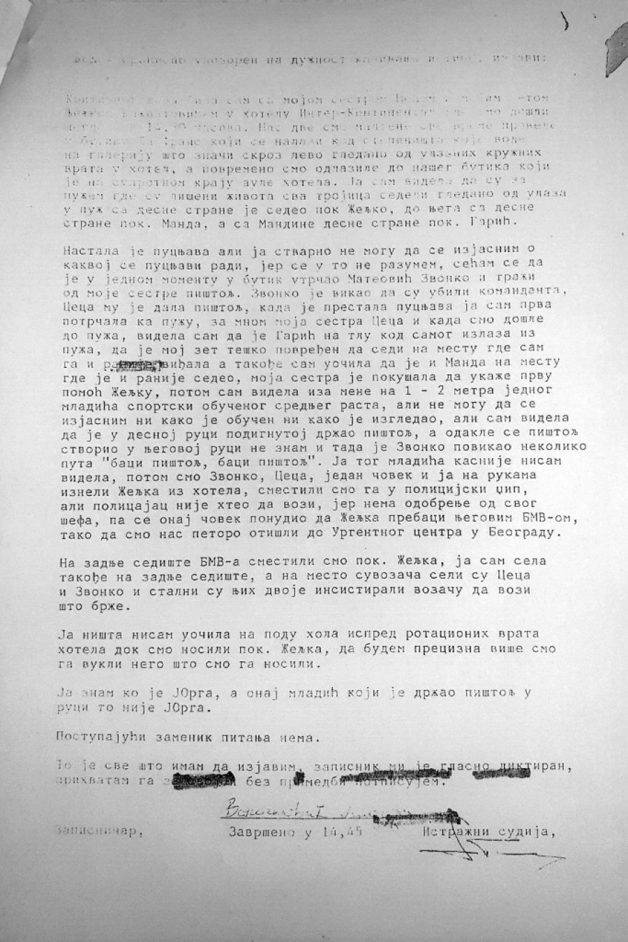 - Po dolasku u hotel svi smo otišli u butik "La France", a pola sata kasnije Željko je izašao da pronađe prijatelja Mandu. Povremeno sam sa sestrom obilazila svoje butike i prolazila pored puža (separe, prim. aut.) u kojem je Željko sedeo s Mandom i Garićem. U jednom trenutku pored njega je sedeo i Branko Jevtović Jorga, a kad sam sledeći put došla, njega nije bilo. Sela sam malo pored supruga i otišla u "La France" - ispričala je Ražnatovićeva.