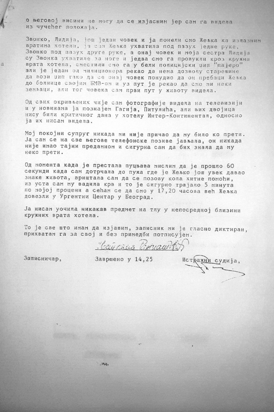 Ranjenog Željka smestili smo u policijski džip, ali je jedan policajac rekao da nema dozvolu starešine da vozi auto, tako da je mog muža drugi čovek prevezao u bolnicu, izjavila je Svetlana Ražnatović na saslušanju