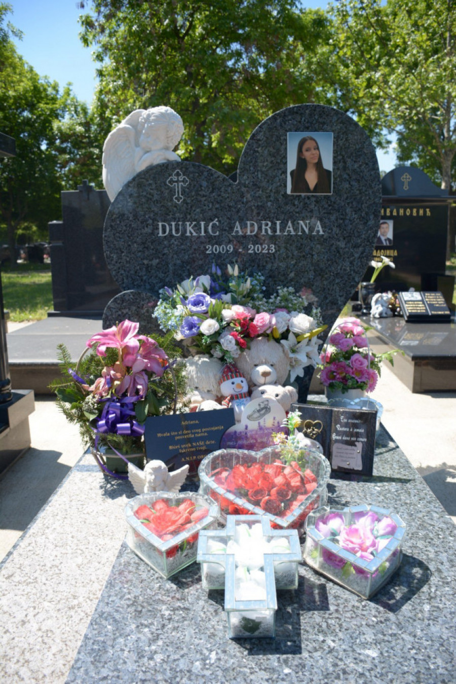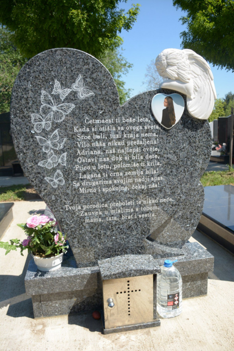 Četrnaest ti beše leta, kada si otišla sa ovog sveta. Srce boli, tuzi kraja nema, Vilo naša, nikad prežaljena! Adriana, naš najlepši cvete, ostavi nas dok si bila dete. Ptico u letu, polomiše ti krila, lagana ti crna zemlja bila. Sa drugarima svojim nađi spas. Mirno i spokojno, i čekaj nas. Tvoja porodica preboleti te nikad neće. Zauvek s tobom tvoji mama, tata, brat i sestra.