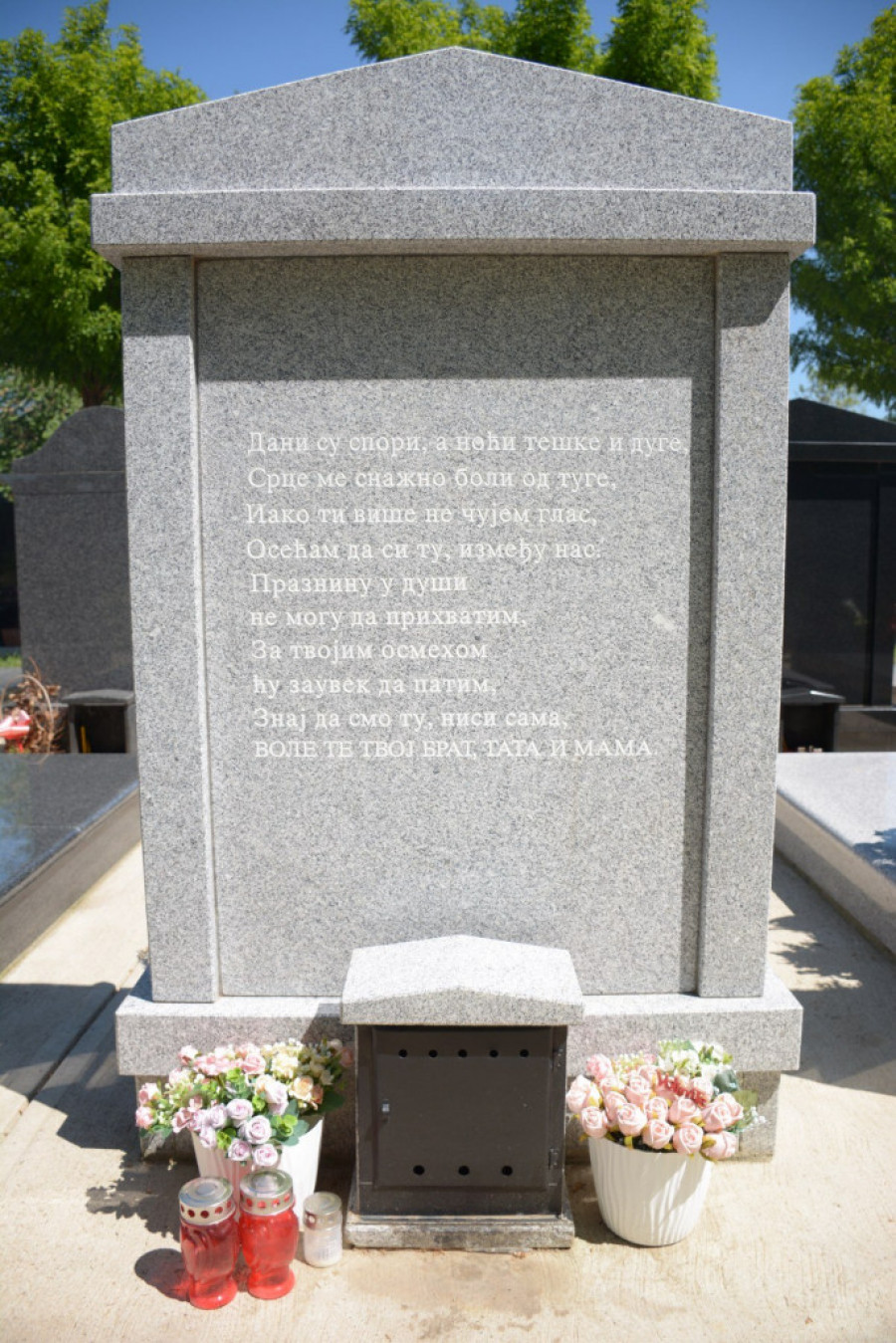 Dani su spori, a noći teške i duge. Srce me snažno boli od tuge. Osećam da si tu, između nas. Prazninu u duši ne mogu da prihvatim. Za tvojim osmehom zauvek ću da patim. Znaj da smo tu, nisi sama. Vole te tvoj brat, tata i mama.