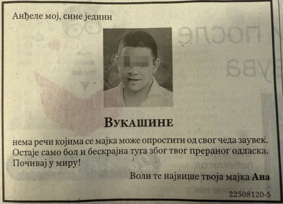 - Anđele moj, sine jedini nema reči kojima se majka može oprostiti od svog čeda zauvek. Ostaje samo bol i beskrajna tuga zbog tvog preranog odlaska. Počivaj u miru! Voli te najviše tvoja majka Ana - napisala je Vukašinova majka u čitulji.