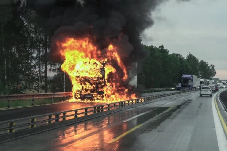 Objavljen je i video snimak kamiona u plamenu, a kako se na njemu vidi, vatra bukti oko celog vozila, a gust dim širi se nebom.