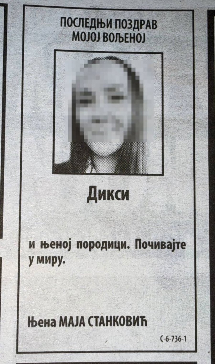 - Poslednji pozdrav mojoj voljednoj Diksi i njenoj porodici. Počivajte u miru - piše u jednoj čitulji posvećenoj Dijani Kajiš.