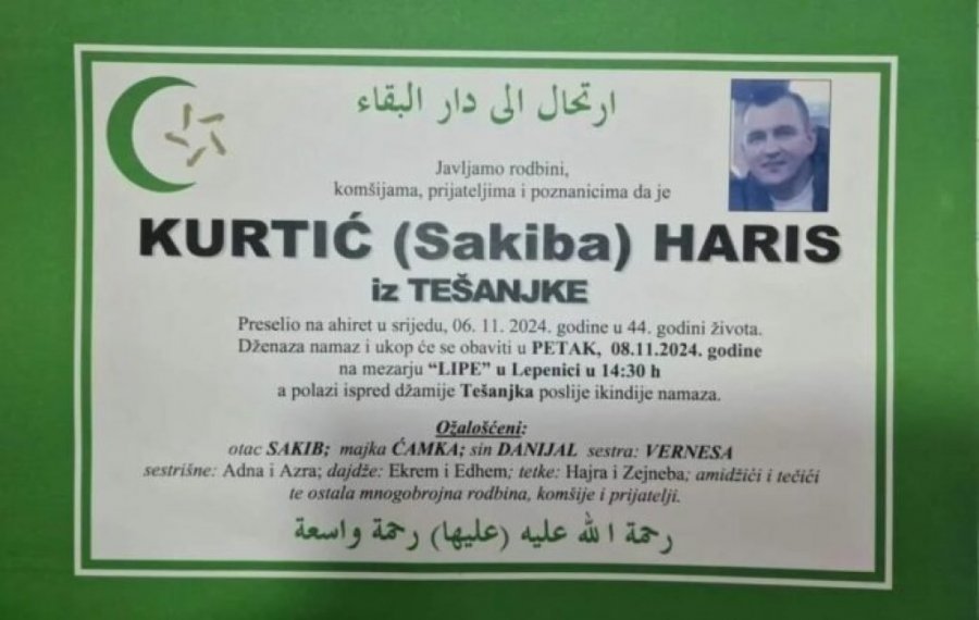 Strašna porodična tragedija potresla je mirno mesto Tešanj u Bosni i Hercegovini. Sin D. K. (18) ubio je svog oca Harisa Kurtića (43) u njihovoj porodičnoj kući. Brzom reakcijom policije osumnjičeni mladič je uhapšen u ulici Braće Pobrića, ali je nakon ispitivanja u tužilaštvu pušten na slobodu. Haris je usled zadobijenih povreda od noža preminuo u Opštoj bolnici u Tešnju.