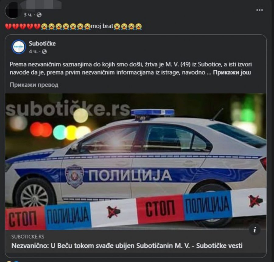 Na Fejsbuk profilu se oglasio brat ubijenog M. V.