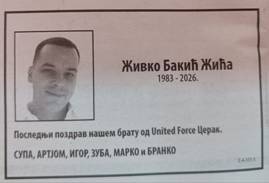 - Poslednji pozdrav našem bratu od "Junajted forsa Cerak" - piše na čitulji koju potpisuju Supa, Artjom, Igor, Zuba, Marko i Branko.