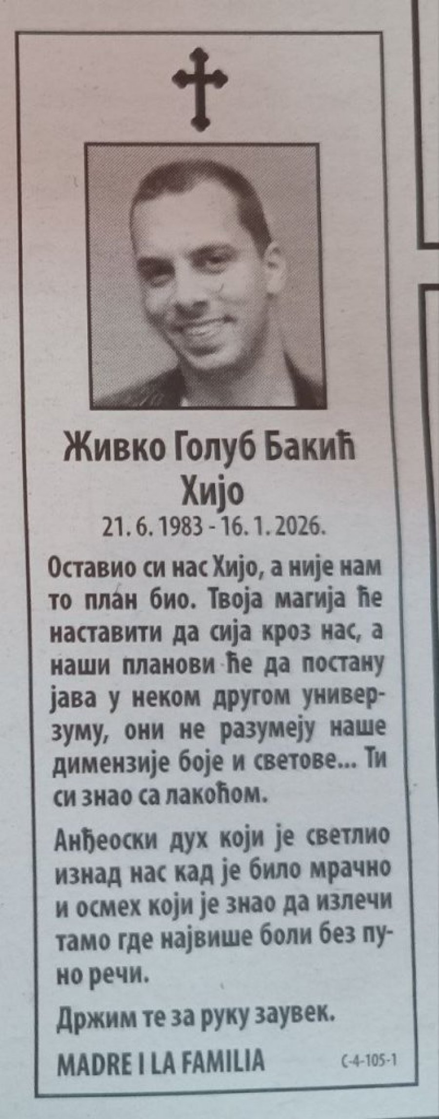 - Ostavio si nas, Hijo, a nije nam to plan bio. Tvoja magija će nastaviti da sija kroz nas, a naši planovi će da postanu java u nekom drugom univerzumu, oni ne razumeju naše dimenzije boje i svetove... Ti si znao s lakoćom. Anđeoski duh koji je svetlio iznad nas kad je bilo mračno i osmeh koji je znao da izleči tamo gde najviše boli bez mnogo reči. Držim te za ruku zauvek - piše u jednoj od čitulja koja je potpisana "Madre i La familia".