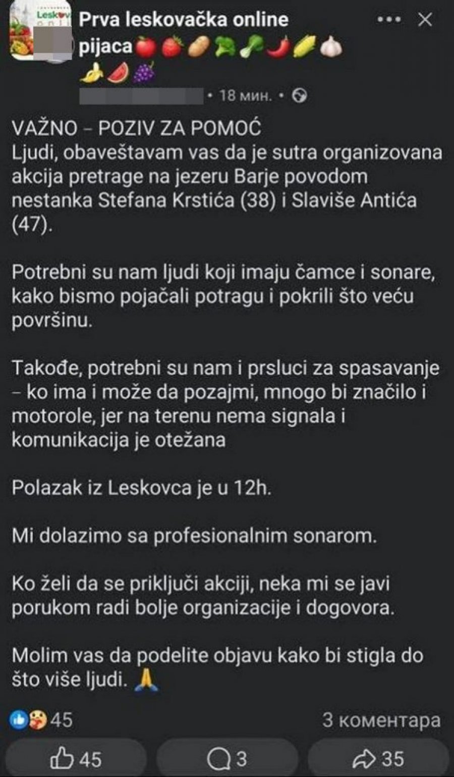 - Ko ima i može da pozajmi, mnogo bi značilo i motorole, jer na terenu nema signala i komunikacija je otežana. Mi dolazimo sa profesionalnim sonarom. Ko želi da se priključi akciji, neka mi se javi porukom radi bolje organizacije i dogovora - navode u objavi. Polazak iz Leskovca je u 12 sati.