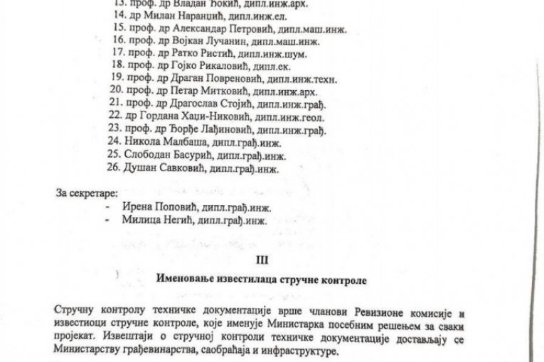 U sastavu te komisije, kako se jasno vidi iz dokumentacije, pod rednim brojem 13 nalazi se rektor Univerziteta u Beogradu Vladan Đokić, dok je pod brojem 3 navedeno ime Vladana Kuzmanovića, bivšeg dekana Građevinskog fakulteta. Komisiju su činili i brojni profesori i inženjeri različitih struka, a njen zadatak bio je da izvrši stručnu kontrolu i da konačno mišljenje o ispravnosti projekta.