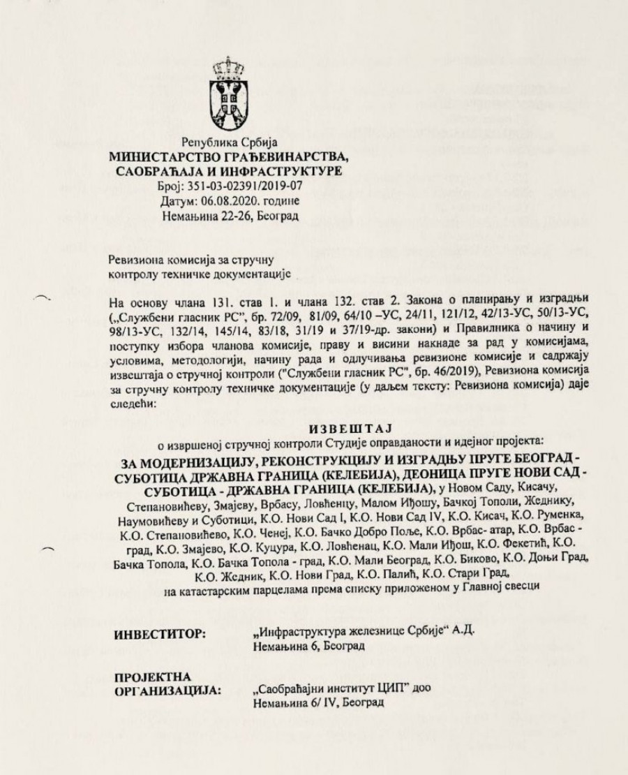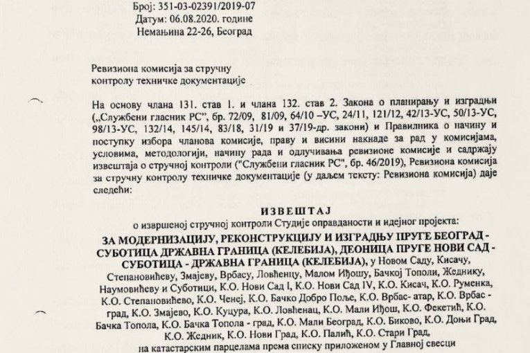 Naime, Reviziona komisija, koja je formirana rešenjem Ministarstva građevinarstva, saobraćaja i infrastrukture 30. novembra 2018. godine, imala ključnu ulogu u odobravanju projekta modernizacije i rekonstrukcije pruge Beograd – Subotica - Kelebija, uključujući i deonicu kroz Novi Sad, odnosno železničku stanicu u Novom Sadu.