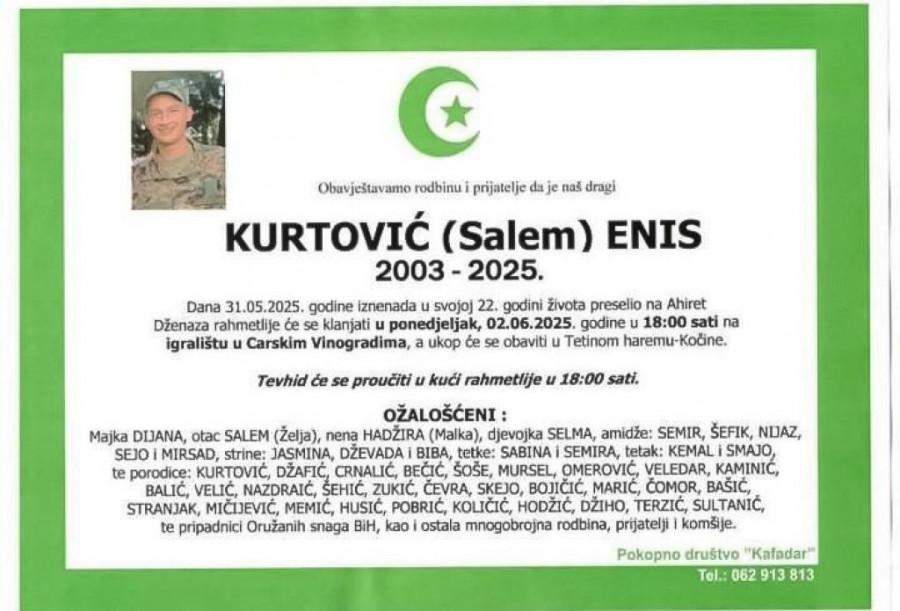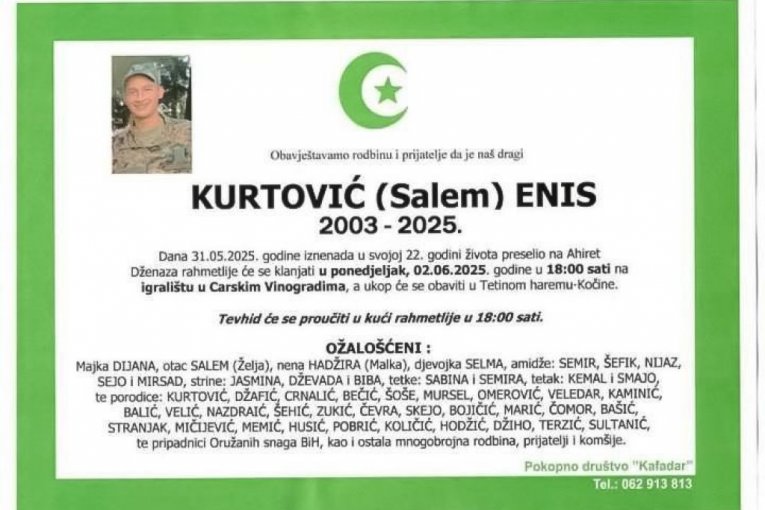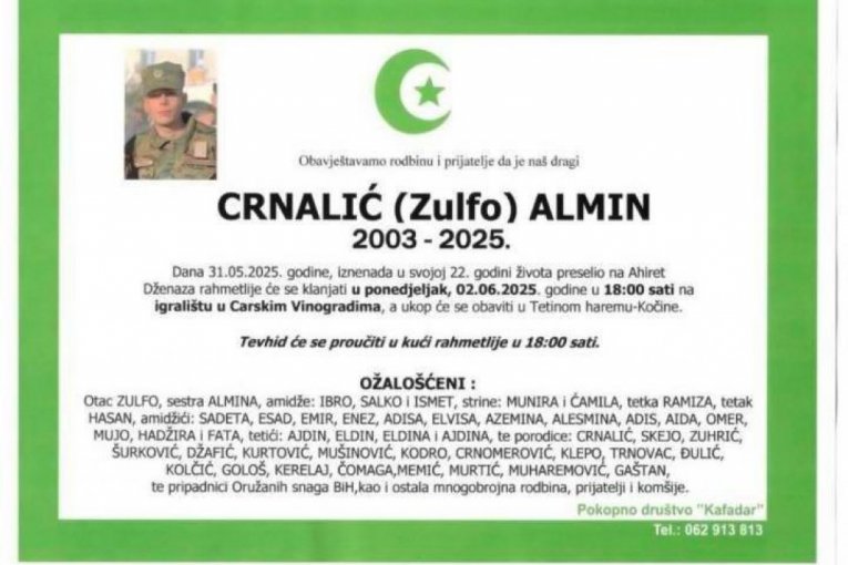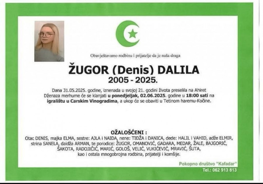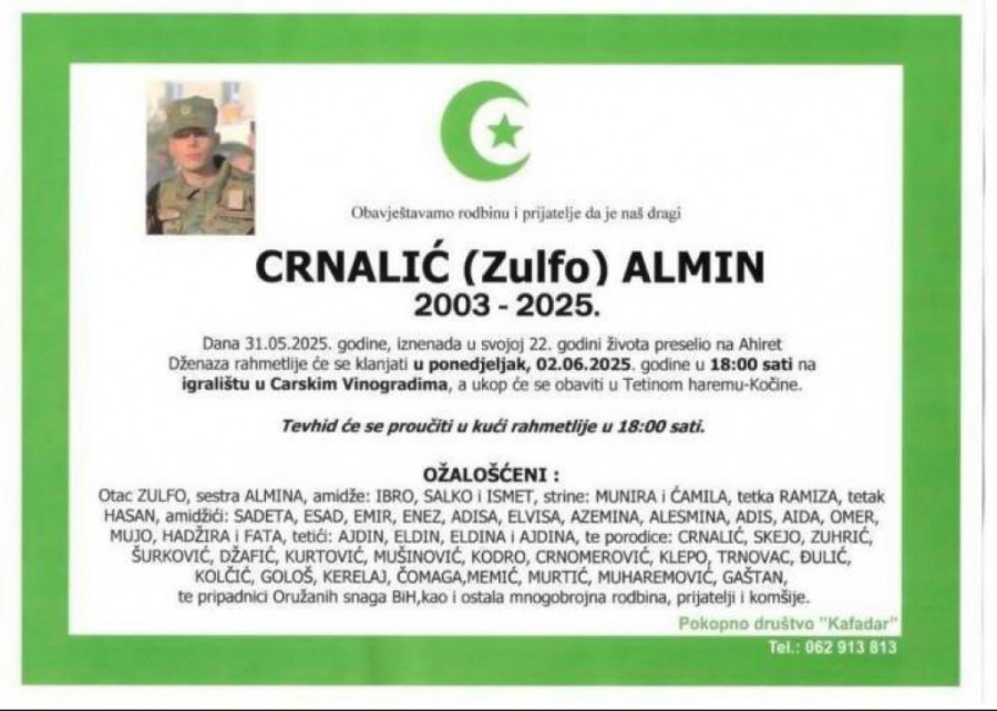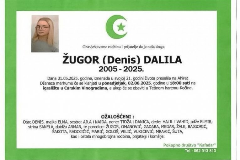 Dženaza će biti klanjana sutra, na igralištu u Carskim Vinogradima, dok će sahrana biti obavljena u Tetinom haremu u Gnojnicama kod Mostara u 18 časova.