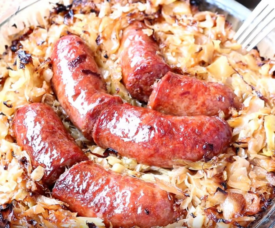 Dodati mlevenu papriku, biber i sve izjednačiti. U podmazan pleh na dno staviti restovan krompir, a odozgo kupus. U sredinu staviti kobasice. Možete ih preseći na pola. Premazati uljem i peći u rerni oko 30 minuta da se sve lepo zapeče. Prijatno!