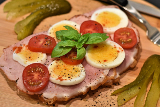 Sečen hleb premažite kečapom, pa između poređajte listove kačkavalja i šunke.