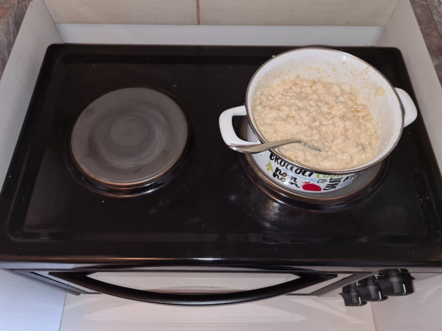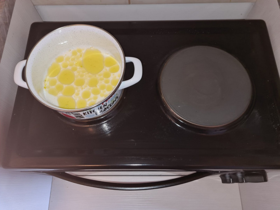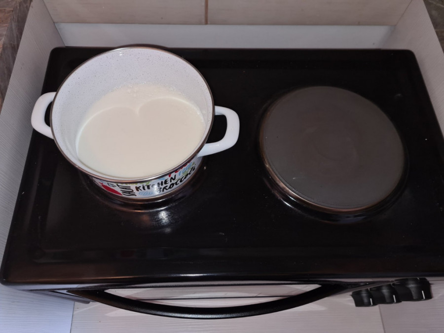 1. Sipao u šerpu 3 dl mleka i 1 dl vode, dodao kašiku i po maslinovog ulja (odokativnom metodom, možda je bilo i malo više)