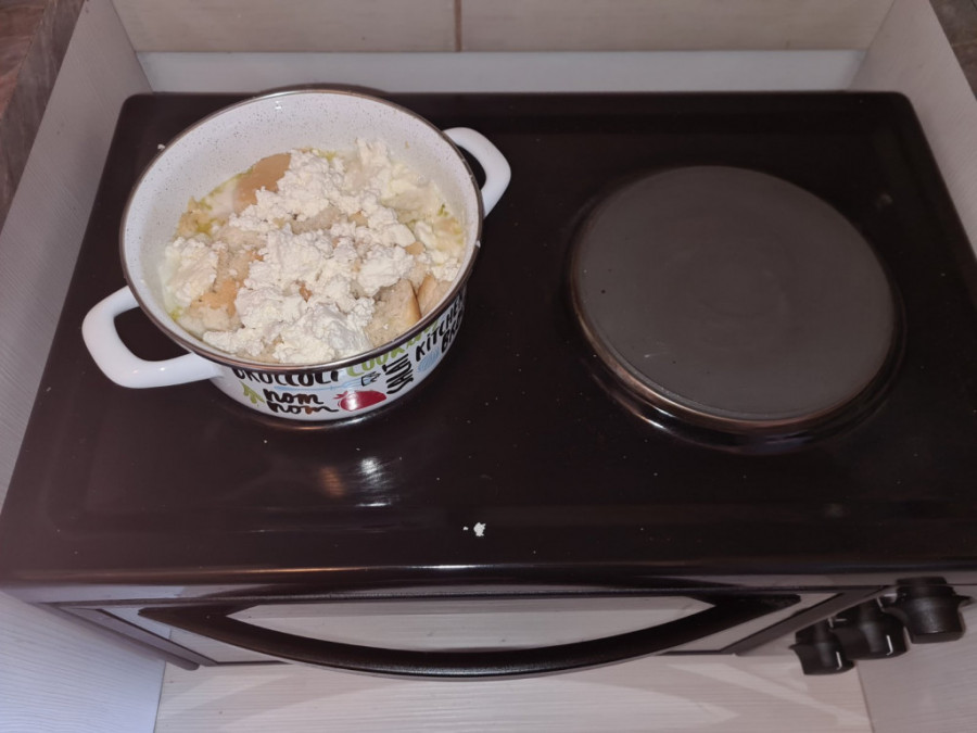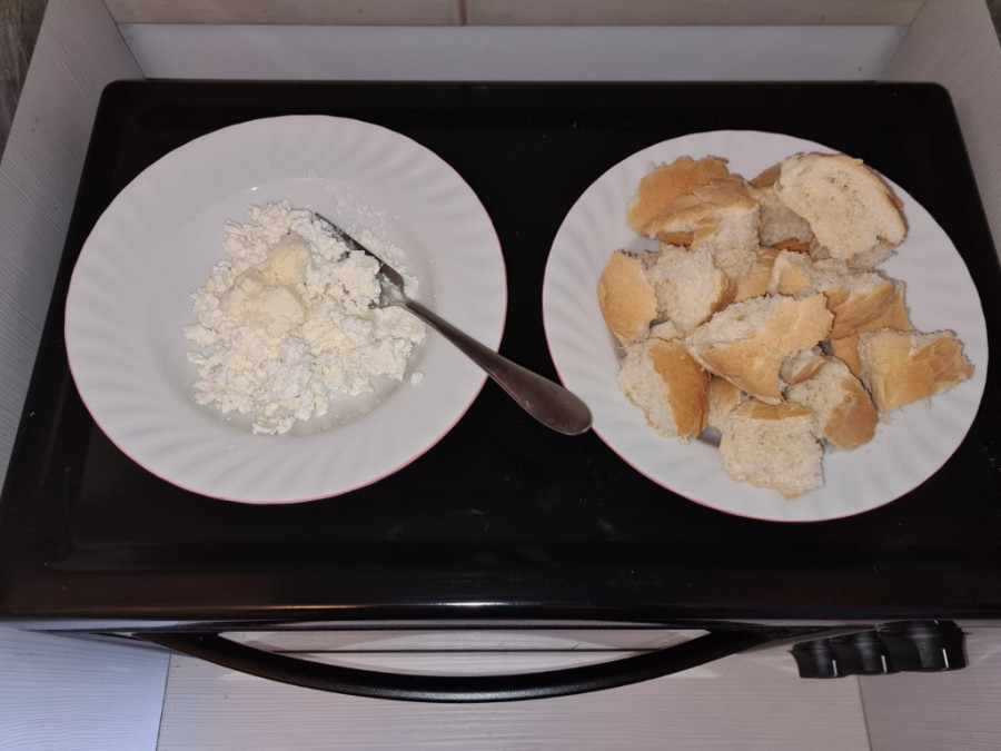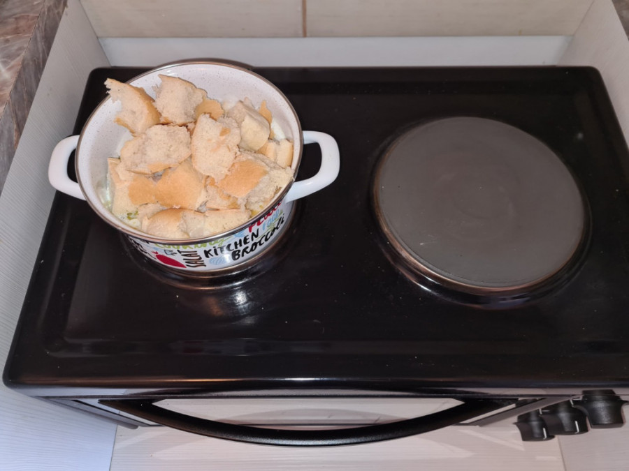 3. Dok nije krenulo da ključa, "pocepao" sam lebac, izgnječio sam oko 100 gr sira i pripremio kajmak