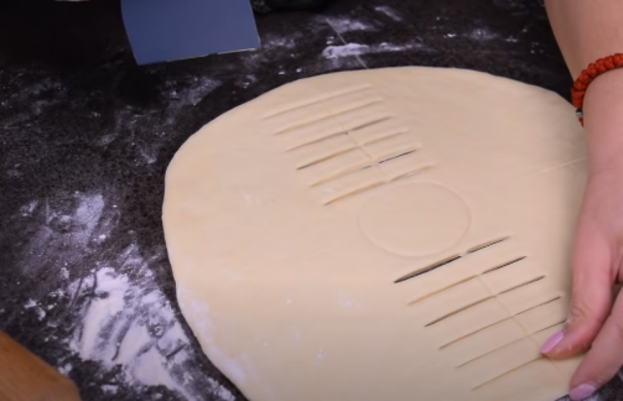 Testo podelite na dva jednaka dela. Onda ga oklagijom premesite i stavite u pleh. Drugu polovinu testa više rastanjite. Uzmite modlicu i pritisnite u sredini. To bi trebalo ovako da izgleda: