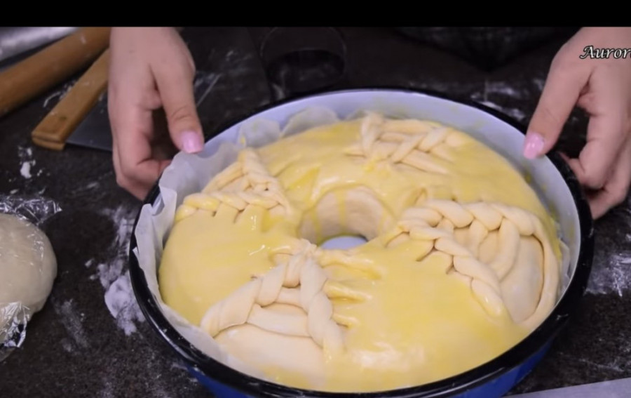 Nakon što ste ukrasili gornji deo prenesite ga na kolač i u sredini modlicom izvucite testo. Kolač premažite jednim umućenim žumancetom. Od testa što vam je ostalo možete napraviti neki simbol.