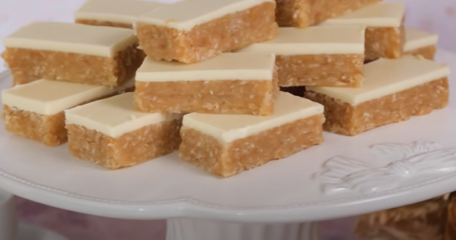 U drugu posudu za paru, iskidajte belu čokoladu i dodajte ulje. Grejte čokoladu na pari uz stalno mešanje. Malo pre nego se sva čokolada otopi pomerite sa vatre i uz mešanje otopite čokoladu do kraja. Naneti čokoladu preko ohlađene smese i ostaviti u frižideru preko noći da se dobro ohladi. Sutradan iseći na štangice i držati u frižideru do posluživanja.