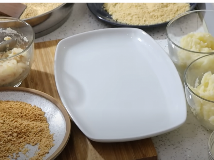 Mi ćemo vam pokazati kako da od jedne smese dobijete tri vrste kuglica. Skuvajte krompir, oko 800 grama. Dodajte u skuvan krompir so i beli luk u prahu ili čen belog luka. Možete sipati i druge začine po ukusu, na primer mleveni biber. U činiju dodajte i posni majonez, da se lepo krompir sjedini. Podelite smesu u šest činija.