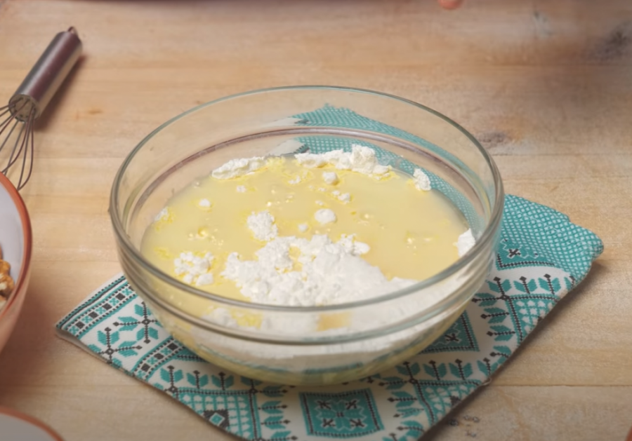 Potrebno vam je 150 grama brašna, u brašno dodate i jednu kesicu praška za pecivo, šest kašika šećera i četiri kašike mlevenih oraha ili lešnika. Sjedinite sve. Smesu zalijete sa 100 mililitara kisele vode i 50 mililitara ulja. Dok pravite smesu, rerna se zagreva na 180 stepeni. U pleh stavite papir za pečenje, a koru lepo rasporedite. Peče se oko 20 minuta.