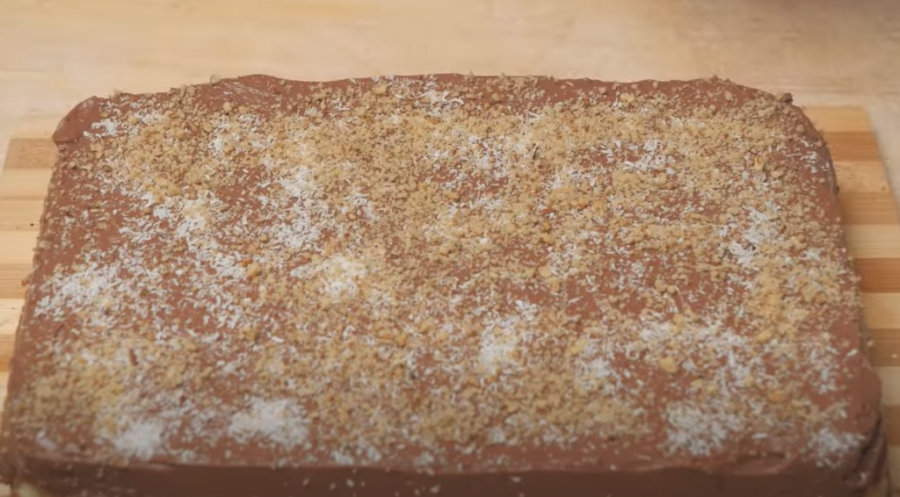 Dalje vam je potrebno 200 grama margarina koji je prethodno bio na sobnoj temperaturi. Umutite ga sa 100 grama šećera u prahu. Nakon toga, kratko umutite i ohlađeni puding. Onda pola pudinga prespite u smesu sa margarinom, i ponovo sve zajedno umutite. Nakon toga dodajte i ostatak pudinga. Smesu podelite na dva jednaka dela. U jedan deo dodajte 100 grama otopljene i prohlađene čokolade. U drugu dodajte tri kašike mlevenih oraha.