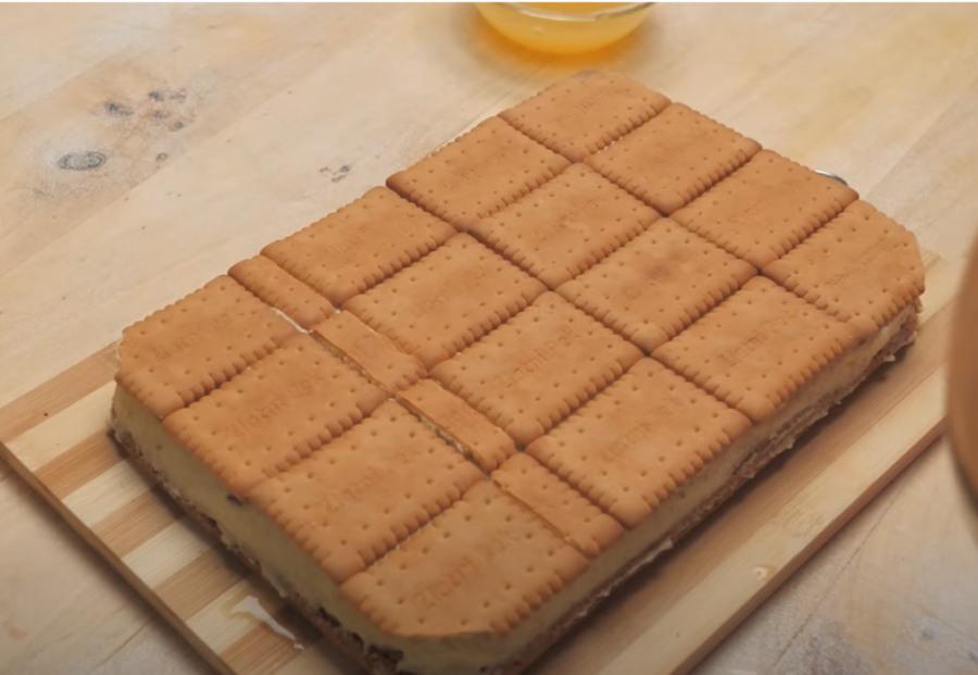 Koru prelijte sa malo soka, moze i kisela voda. Nanesite ceo fil sa orahom na koru, a preko stavite keks takođe natopljen u soku. Preko keksa stavite fil sa čokoladom. Na kraju kolač možete posuti kokosom, čokoladom, orahom... Čime god želite!