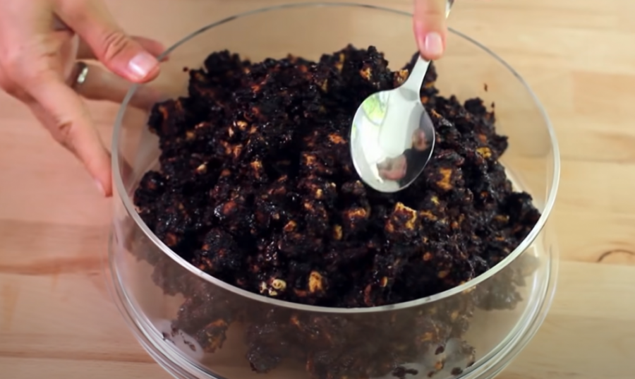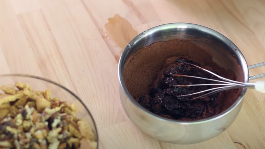Kupite bilo koji keks i rukama ga smrvite. Na zagrejanu ringlu stavite orahe. Pecite ih oko pet minuta na tihoj vatri. U posebnu činiju sipajte šećer. Dodajte mu kakao prah oko pola šolje. Sjedinite sve ručnom mutliciom uz postepeno dodavanje vode. Mešajte dok smesa ne postane skroz tečna. Zatim joj dodajte puter koji je bio na sobnoj temperaturi. Stavite na ringlu da se otopi na tihoj vatri. Trebalo bi da se kuva 7 - 8 minuta. Nakon toga sklonite sa ringle i neka tako stoji oko 10 minuta. U smesu možete dodati i malo ekstrakta vanile ako imate.