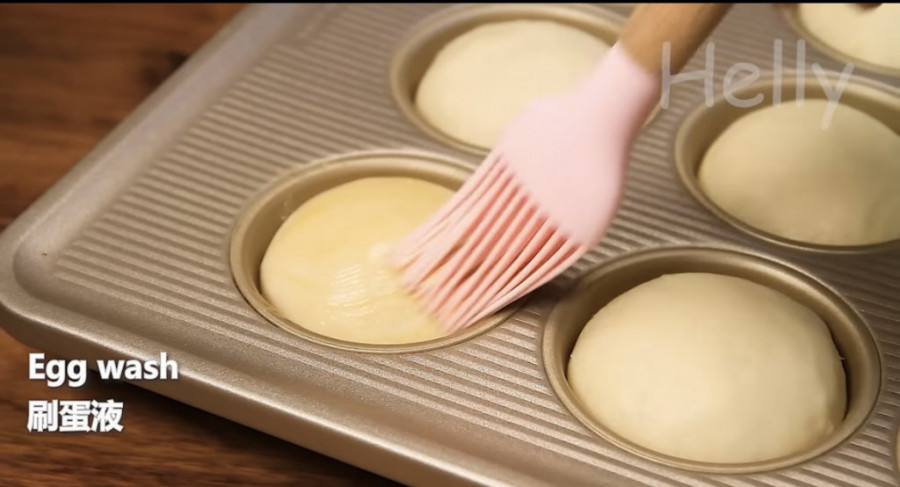 Opet testo pokrijete providnom folijom dok se veličina ne udvostruči. Testo stavite na radnu površinu prethodno posutu brašnom. Podelite ga na 12 delova. Svaki deo oblikujte u lopticu. Poređate ih u kalup za mafine i ostavite da se testo diže još 45 minuta. Namažite preko preostalo jaje. Peče se 15 - 18 minuta na 180 stepeni. Dodatno možete posuti susamom.