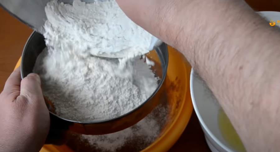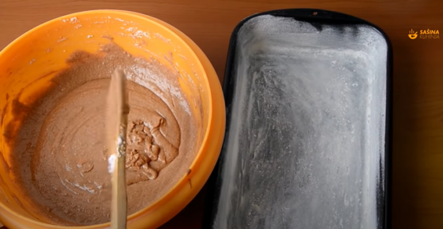 U posebnu činiju stavite 300 grama brašna i jedan prašak za pecivo. Promešajte rukom, pa prosejte direktno u činiju sa čokoladnim filom. Mešajte ručnom mutilicom.