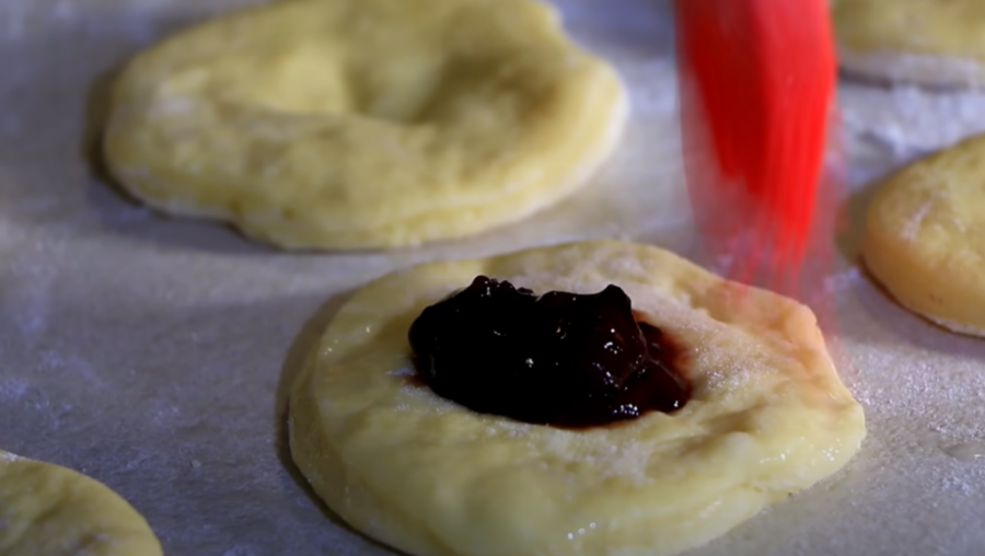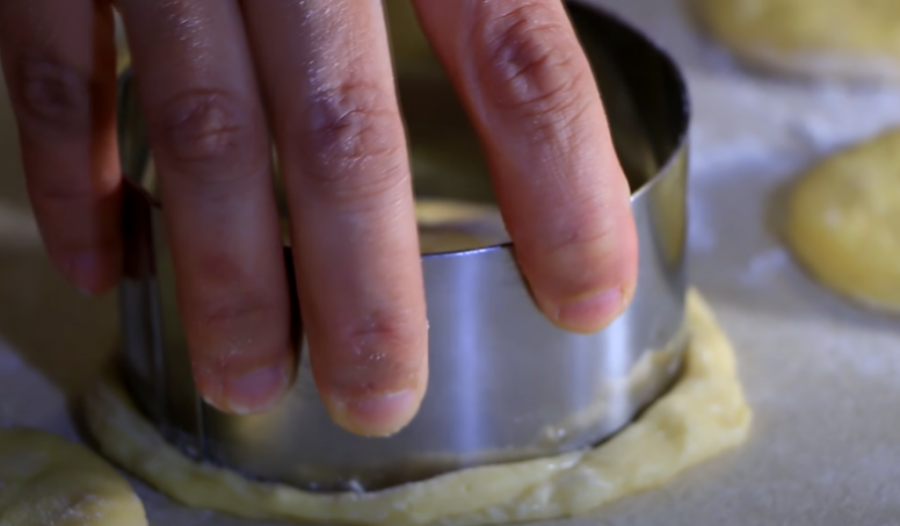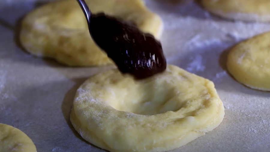 Onda uzmete kalup i njim skinete ivice sa napravjlene krofne, pogledajte kako. Umutite viljuškom jedno celo jaje pa premažite krofnu. Tako premazane neka stoje do pola sata, minimalno 15 minuta. Krofne se peku 25 minuta na 180 stepeni. Kada su gotove uvaljajte ih u prah šećer, a na svaku možete staviti još džema ili krema.