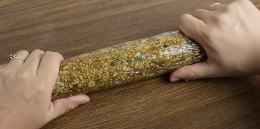 Semenke malo propržite na vrućem tiganju da budu hrskavije. Urme očistite i sitno iseckajte. Suve kajsije takođe iseckajte sitno. Nekoliko kockica kajsija ostavite za kasnije. Sameljite u blenderu urme i kajsije. Dodajte smesi susam i semenke. Idealno bi bilo da imate i malo kore pomorandže. Smesi dodajete sitno iseckan orah i one veće komadiće od kajsije. Oblikujete je rukama uz pomoć providne folije. Pospite na providnu foliju pečeni susam pa tu opet uvaljajte rolat. Ponovite to dok svaki deo ne bude lepo uvaljan.