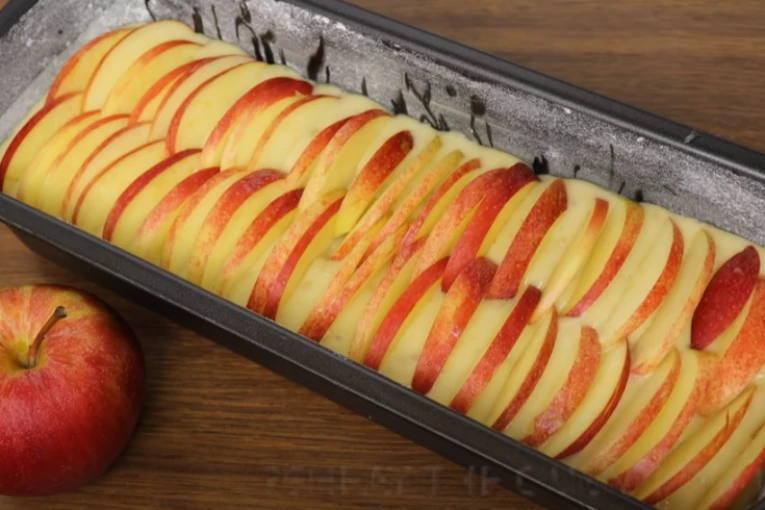 Pleh namažite puterom, stavite brašno preko pa sklonite višak. Izlijete smesu. Jabuke isecite na tanke delove. Ređajte ih u smesu.
