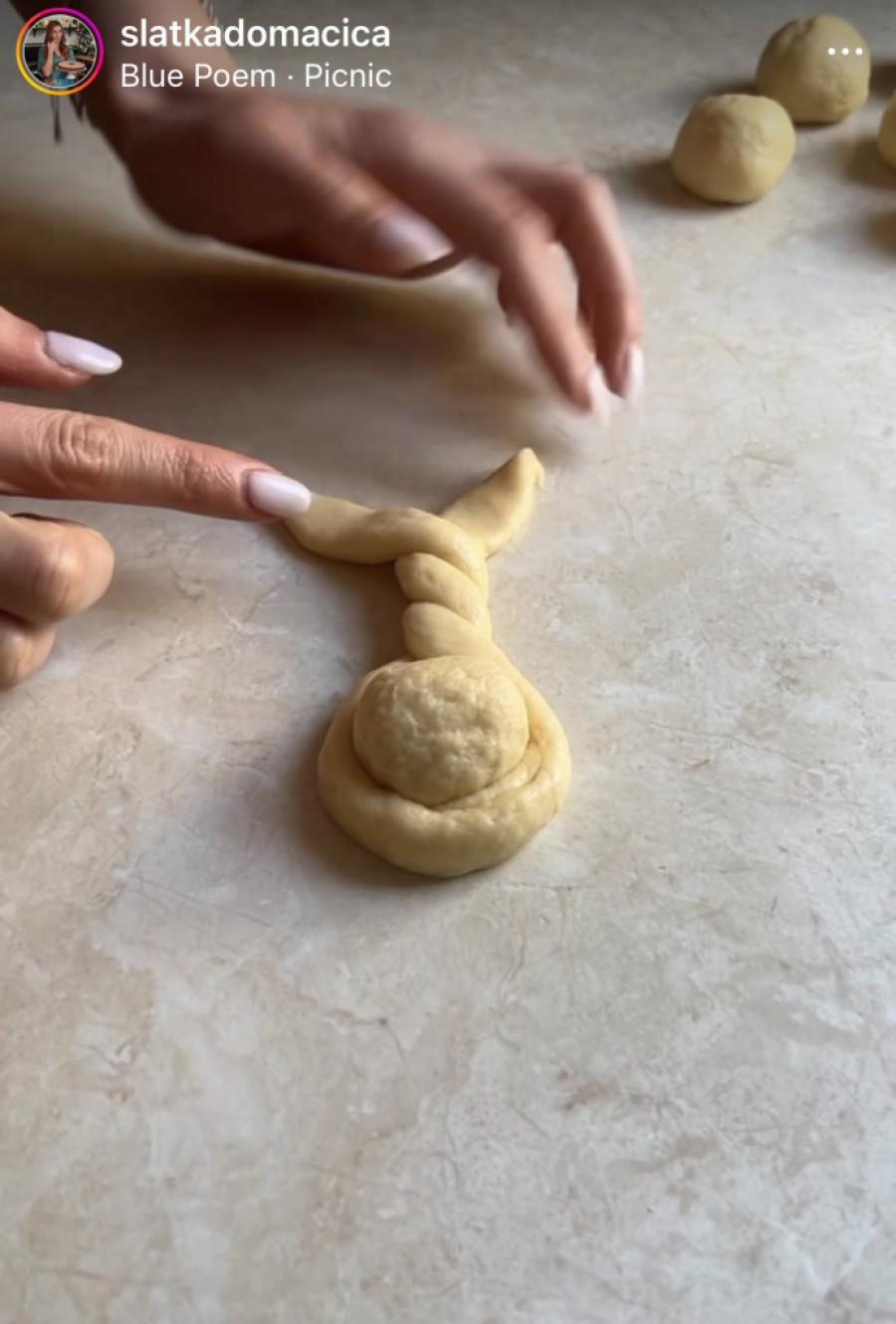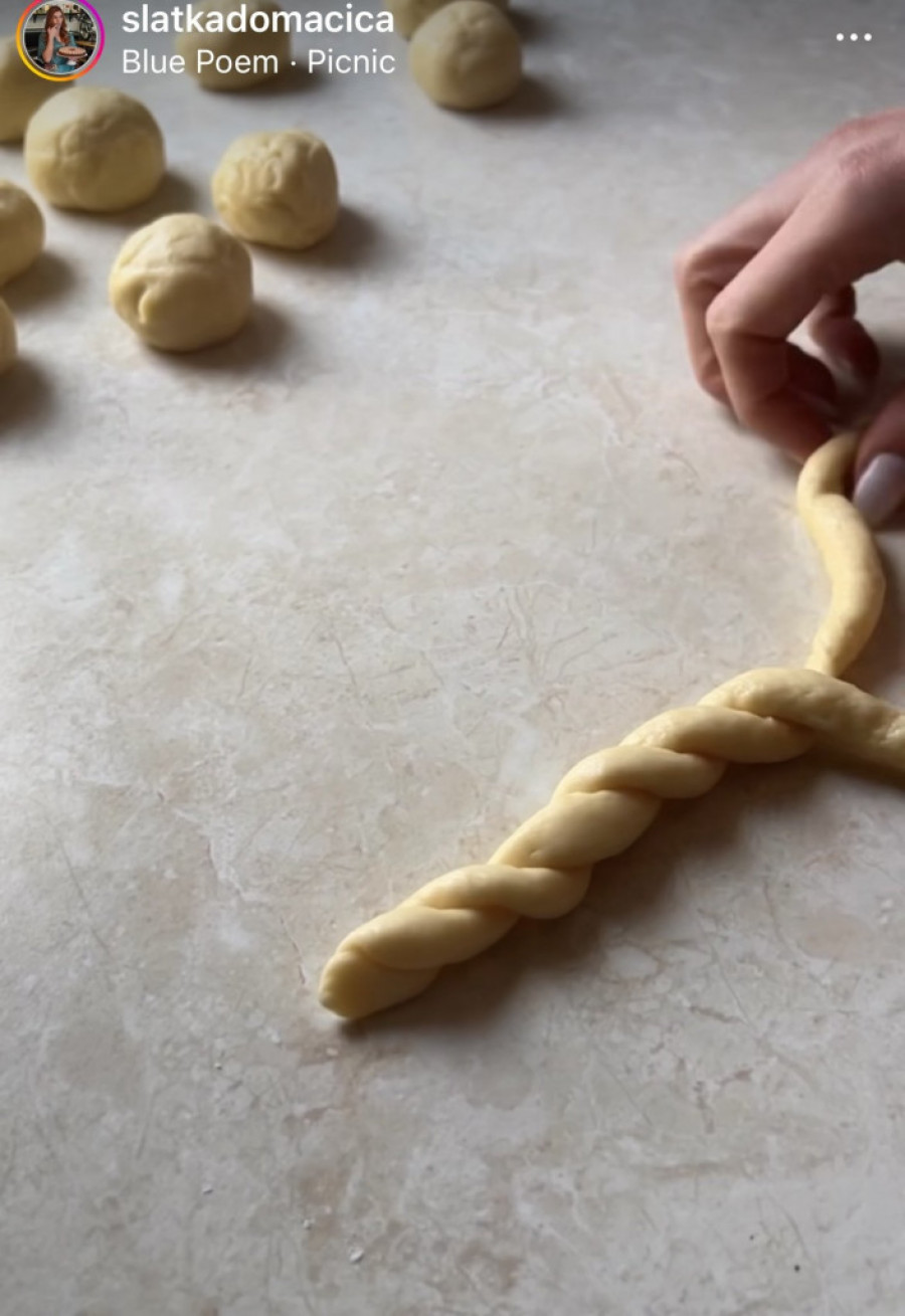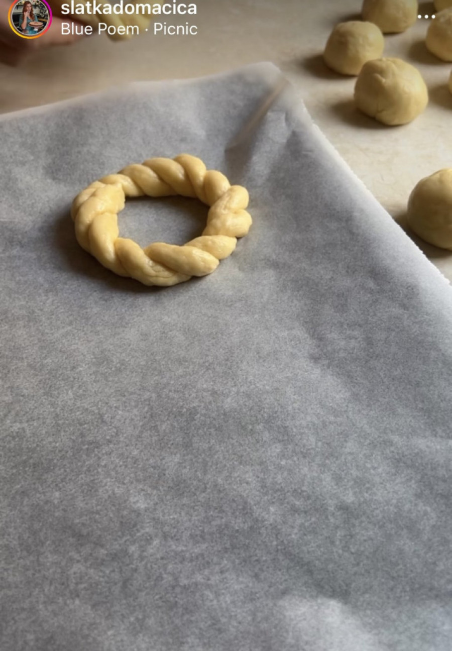 5. Za venčiće potrebno je napraviti po 2 pramena dužine 30 centimentara. Njih zatim uviti u spiralu i formirati venčić. Obratite pažnju da otvor venčića bude dovoljno velik kako bi u njega nakon pečenja stalo jaje.