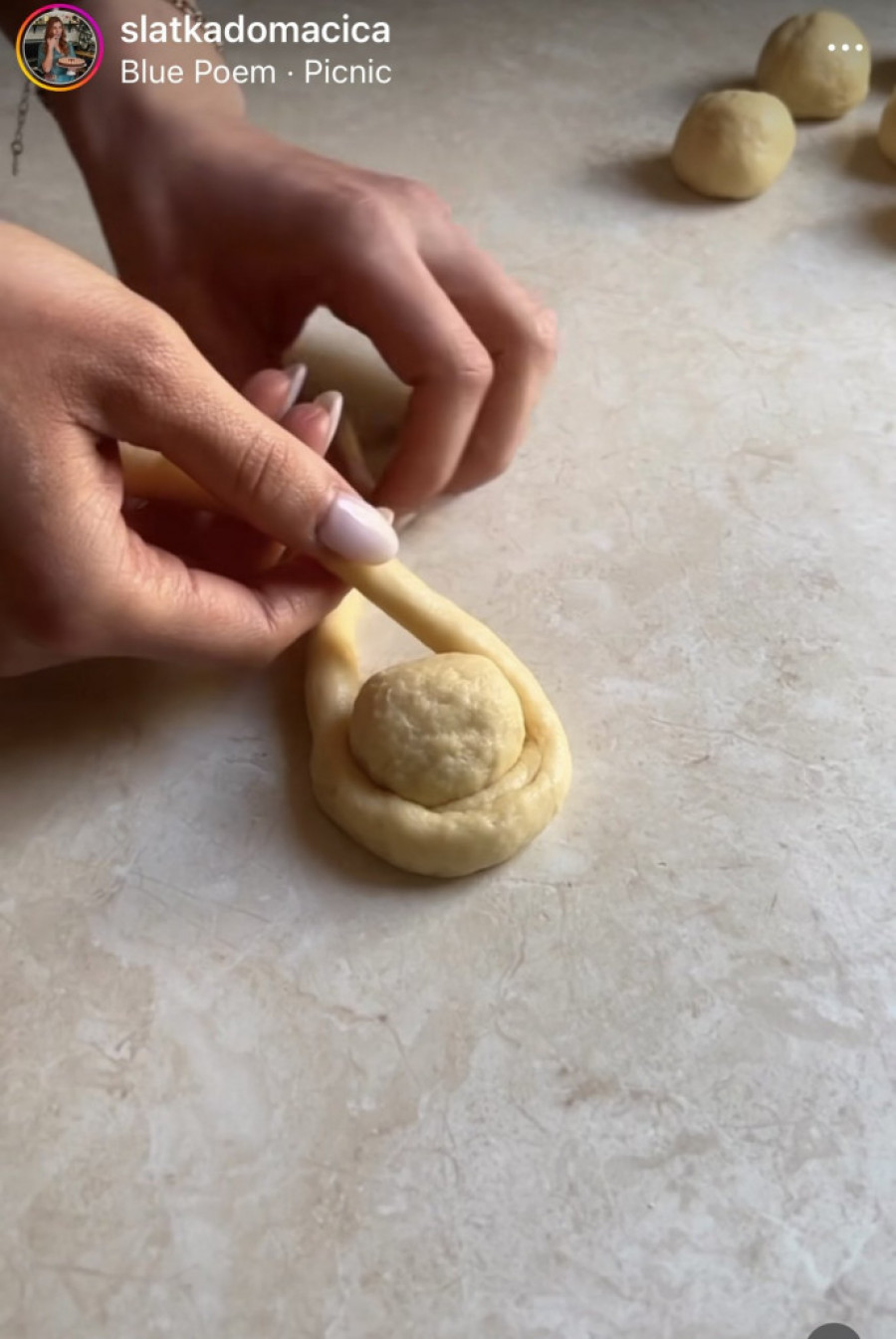 4. Na podlogu posuti brašno, premesiti testo i formirati loptu. Loptu zatim podeliti na 16 delova od kojih se ponovo prave loptice.