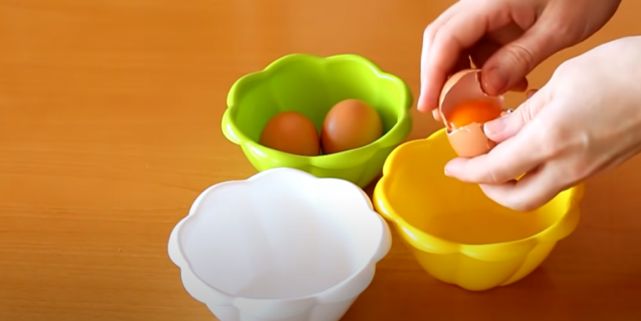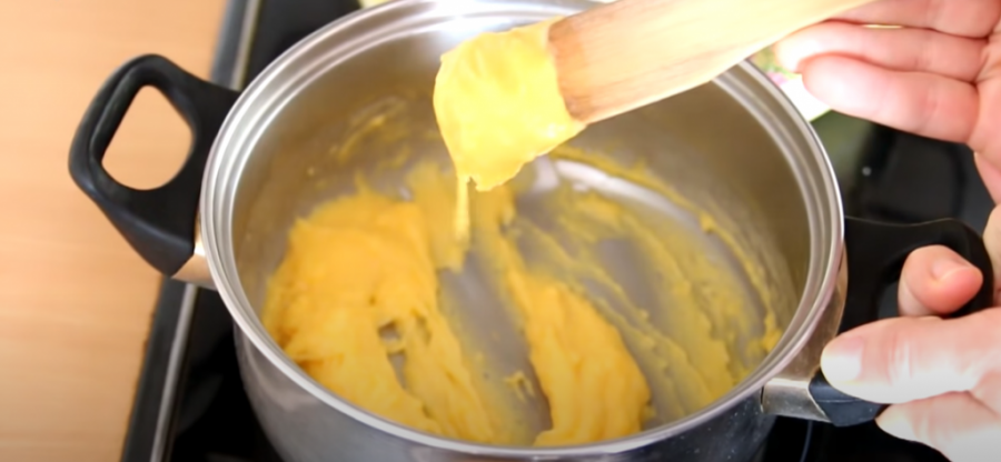 U drugu posudu stavite tri žumanceta i dve velike kašike šećera. Mutite dva minuta mikserom, dodajte dve kašike brašna i mutite još pola minuta. Žumanca prespite u šerpu, kuvajte na skroz blagoj temperaturu uz stalno mešanje. To radite sve dok smesa ne postane jako žuta i dok se ne stegne.