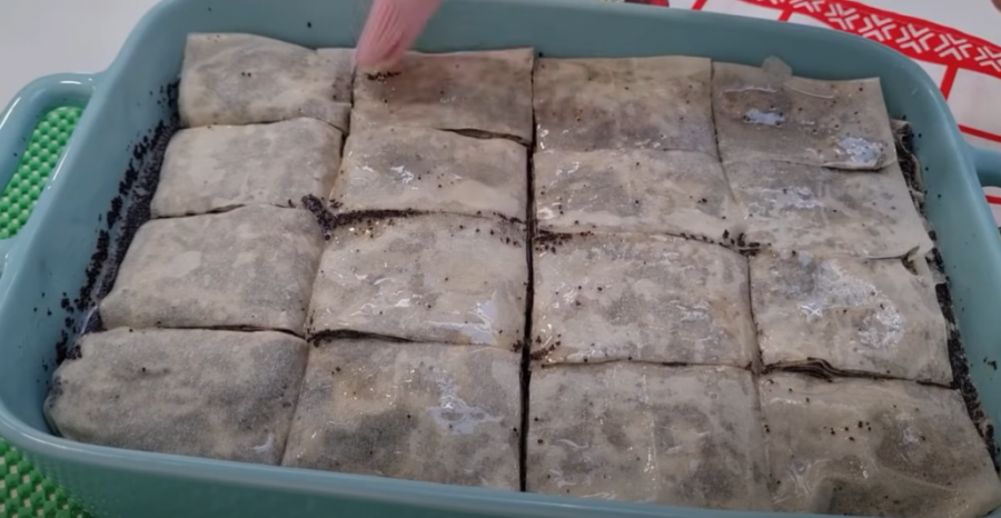 Na vrh sve preklopite sa jednom korom i uvucite ivice sa strane. Premažite je uljem. Stavite još jednu koru i takođe podvite sa strane. Pre pečenja isecite makovnjaču na kockice. Svaku posebno premažite uljem.