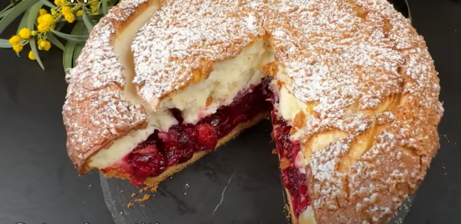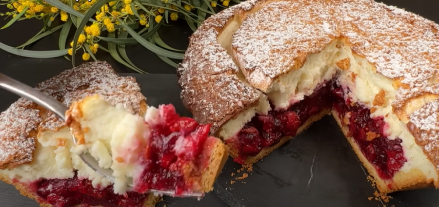 U šerpi pomešajte višnje koje ste odmrzli i ocedili od viška vode, zatim dodajte skrob, šećer i vodu. Kuvajte dok se ne zgusne, uz neprestano mešanje. Pokrijte providnom folijom i ostavite da se ohladi. Umutite žumanca sa prstohvatom soli i šećerom u prahu, pa dodajte istopljeni puter. Promešajte, pa dodajte vanilu i prosejano brašno. Umesite testo, pa isecite manje parče, pokrijte ga folijom i stavite u zamrzivač na 15 minuta. U kalup za kuglof (ili običan okrugli) utisnite veći komad testa, po dnu i ivicama. Sipajte džem od višanja i poravnajte. Umutite jogurt, skrob i vanilu, a u drugoj posudu kratko umutite belanca sa prstohvatom soli, pa postepeno dodajte šećer i mutite dok ne dobijete čvrst šne. Dodajte šne u jogurt i lagano umešajte. Fil sipajte preko voća i poravnajte. Izvadite testo iz zamrzivača, pa izrendajte preko. Pecite u zagrejanoj rerni na 180 stepeni oko 40 minuta, piše "Stvar ukusa".