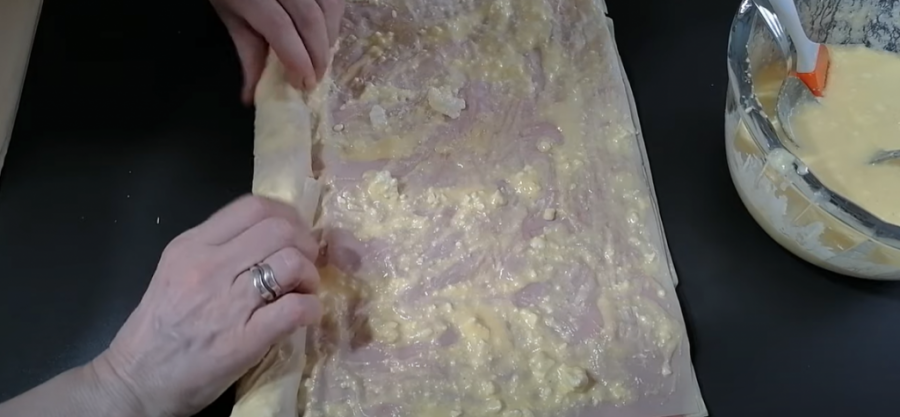 Sir usitnititi, a onda dodati tri cela jajeta. Izmešajte pa dodajte prašak za pecivo, jogurt i ulje. Uzmite jednu koru i namažite je sa tri kašike fila, a onda je preklopite drugom korom i ponovite postupak. Kada stavite treću koru takođe stavite fil koji ćete razmazati, a onda preko istog odnosno preko cele kore stavite šunku to je oko 12 listova. Preklopite korom, to je već četvrta i stavite tri kašike fila. Urolajte je kao na fotografiji. Od navedene smese dobićete tri takva rolata.