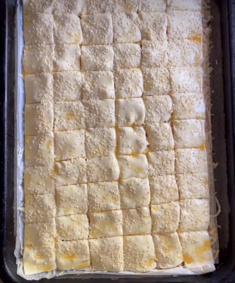 Najbolje je da kupite gotovo lisnato testo. Odmah ga stavite u pleh obložen papirom za pečenje. Premažite prvu koricu sa krem sirom, preko stavite šunku a onda i narendate kačkavalj. Preko toga naneti opet krem sir “kao lepak”. Preko svega staviti rastanjeno lisnato testo i zaseći nožem na kockice. Premazati umućenim jajetom i posuti susamom. Peći u prethodno zagrejanoj rerni na 200 stepeni dok ne dobije zlatnu boju.