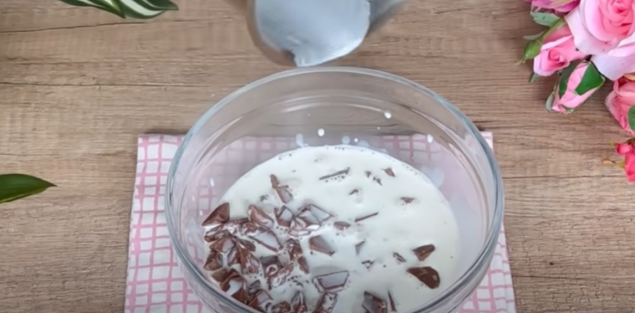 Čokoladu sitno iseckajte ili izlomite pa prelijte sa malo vrelog mleka da se otopi. Sjedinite. Dodajte kikiriki.