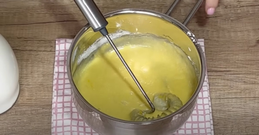 U šerpu razbijete jedno jaje, dodate prstohvat soli i šećer oko 50 grama. Takođe, sjedinite sa vanilin šećerom, kukuruznim skrobom i brašnom. Spojite dok ne postane žute boje kao na fotografiji.