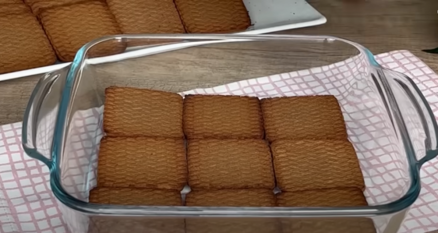Zatim vam je potreban čokoladni keks. Poređajte ga u neku vatrostalnu činiju kao na fotografiji. Izlijete jedan deo fila i razmažete. Preko toga stavite još jedan red keksa, a potom ponovo fil. Ponovite taj korak još jednom, i radite tako sve dok ne potrošite napravljen fil. Bitno je da na vrhu bude samo fil, a ne da se završava keksom.