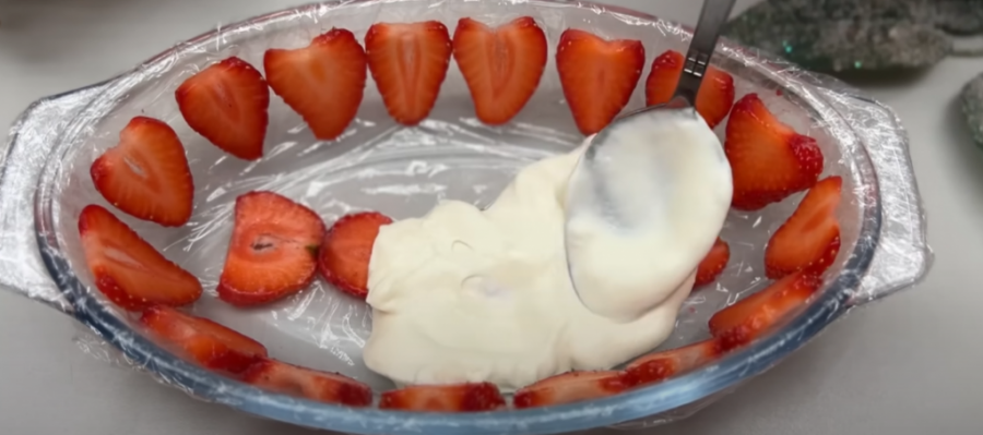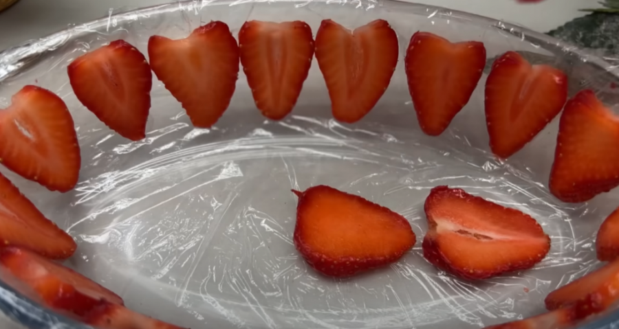 Tanko iseckajte jagode. Uzmite jednu manju činiju i sa svih strana stavite providan papir, odnosno foliju.