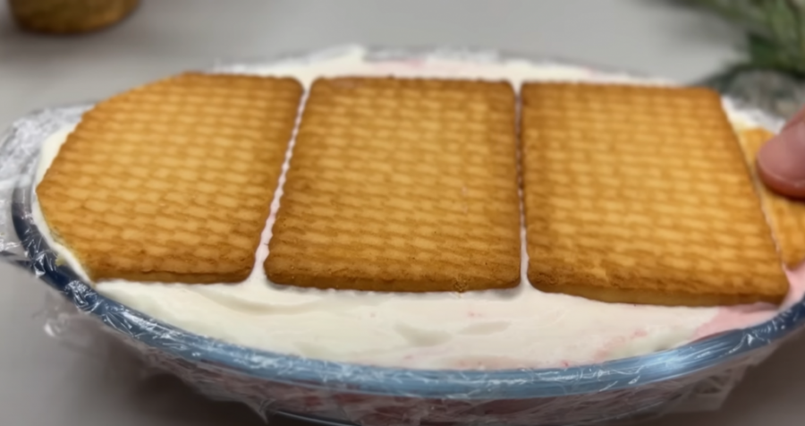 Na kraju dodajte keks po izboru na vrh. Pokrijte providnom folijom i ostavite u zamrzivaču dva sata da se stegne. Kada budete vadili sladoled, okrenite ga naopačke da donja strana bude zapravo gornja.