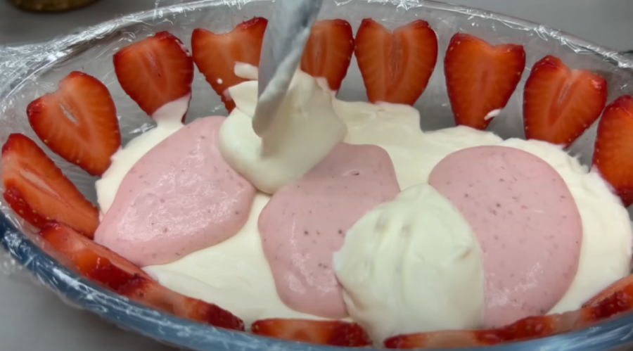 Sjedinite sve kašikom, a onda sipajte fil preko jagoda. Odnosno prvo sipate fil bez umućenih jagoda na dno, a potom fil koji ste sjedinili.