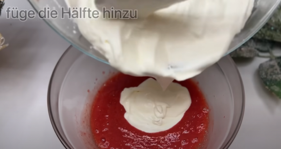 Pola umućenog fila dodajte u kašu od jagoda.