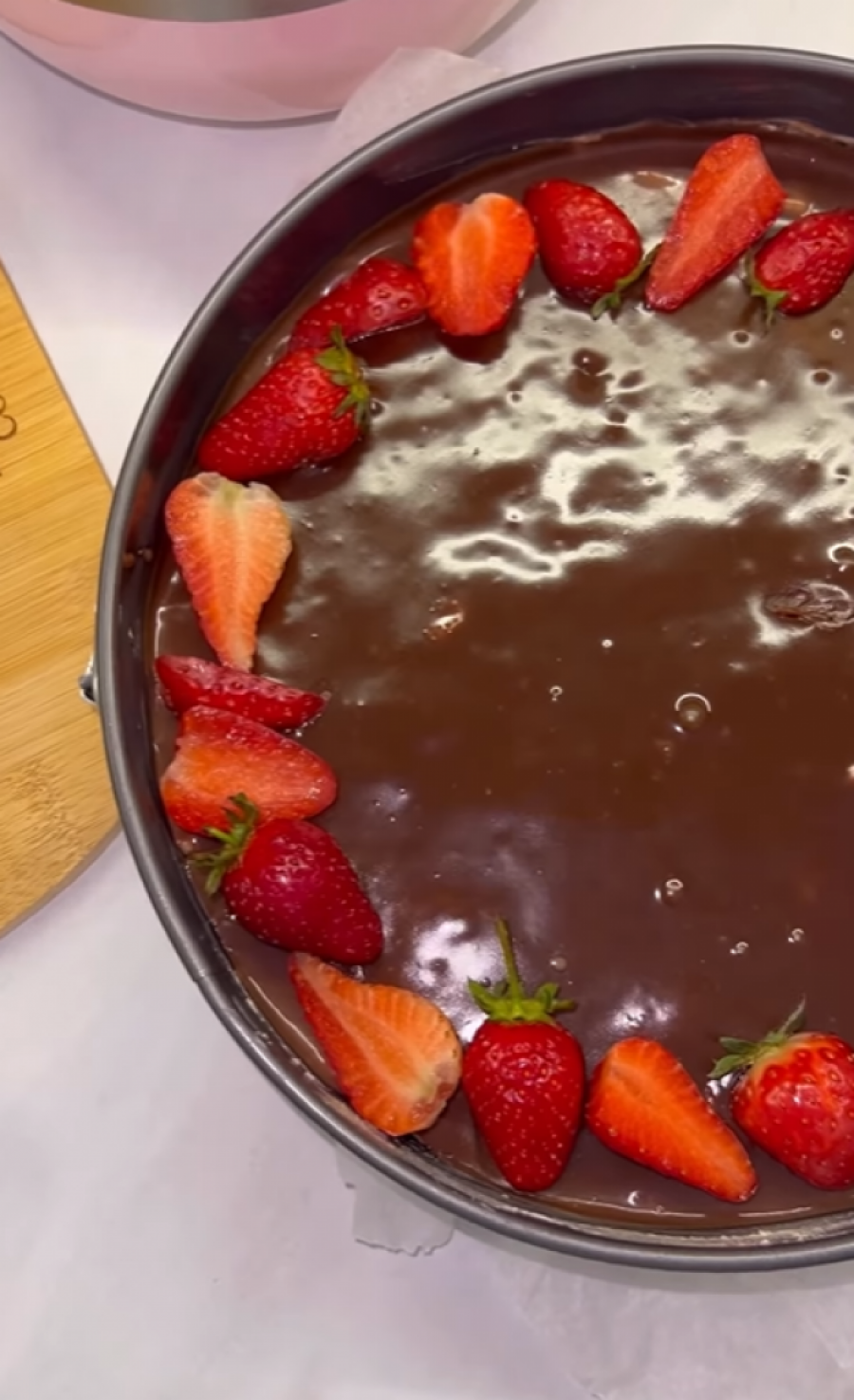 Potom slatku pavlaku sjedinite sa otopljenom čokoladom. Smesu od krem bananice prespite u kalup i zagladite kašikom. Preko stavite glazuru od istopljene čokolade. Na kraju tortu dekorišite jagodama.